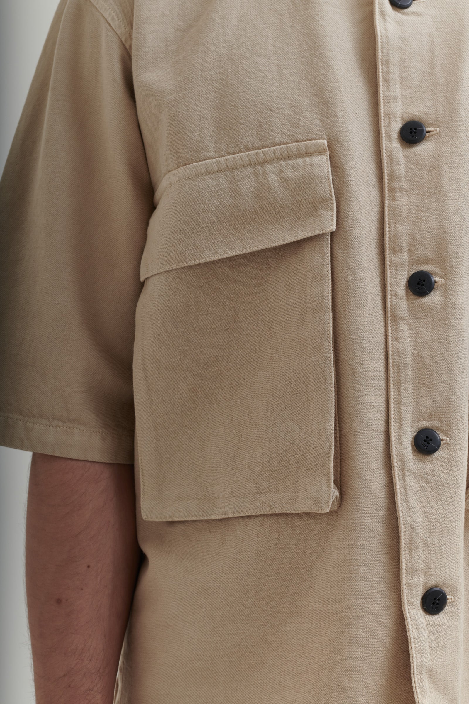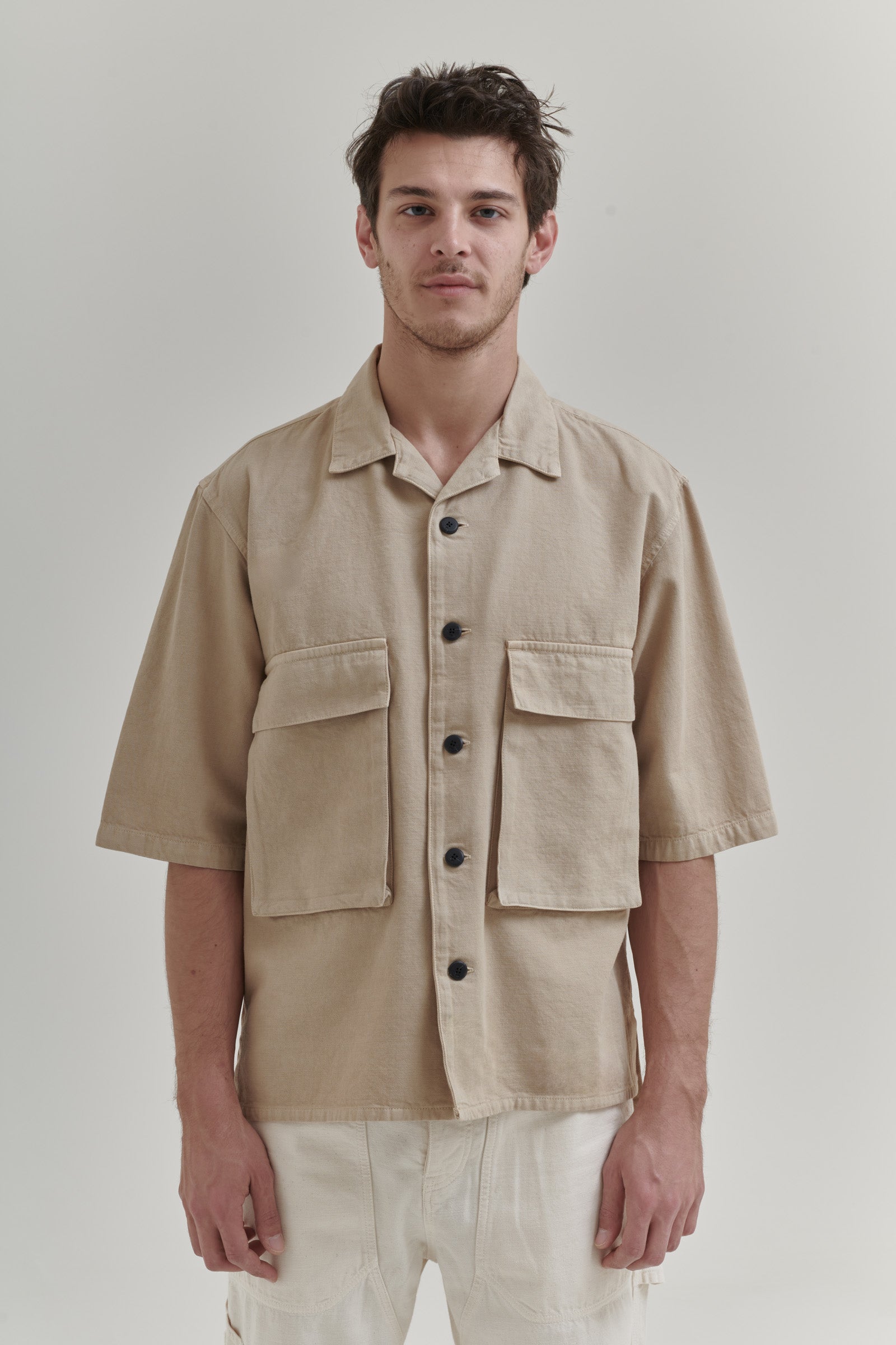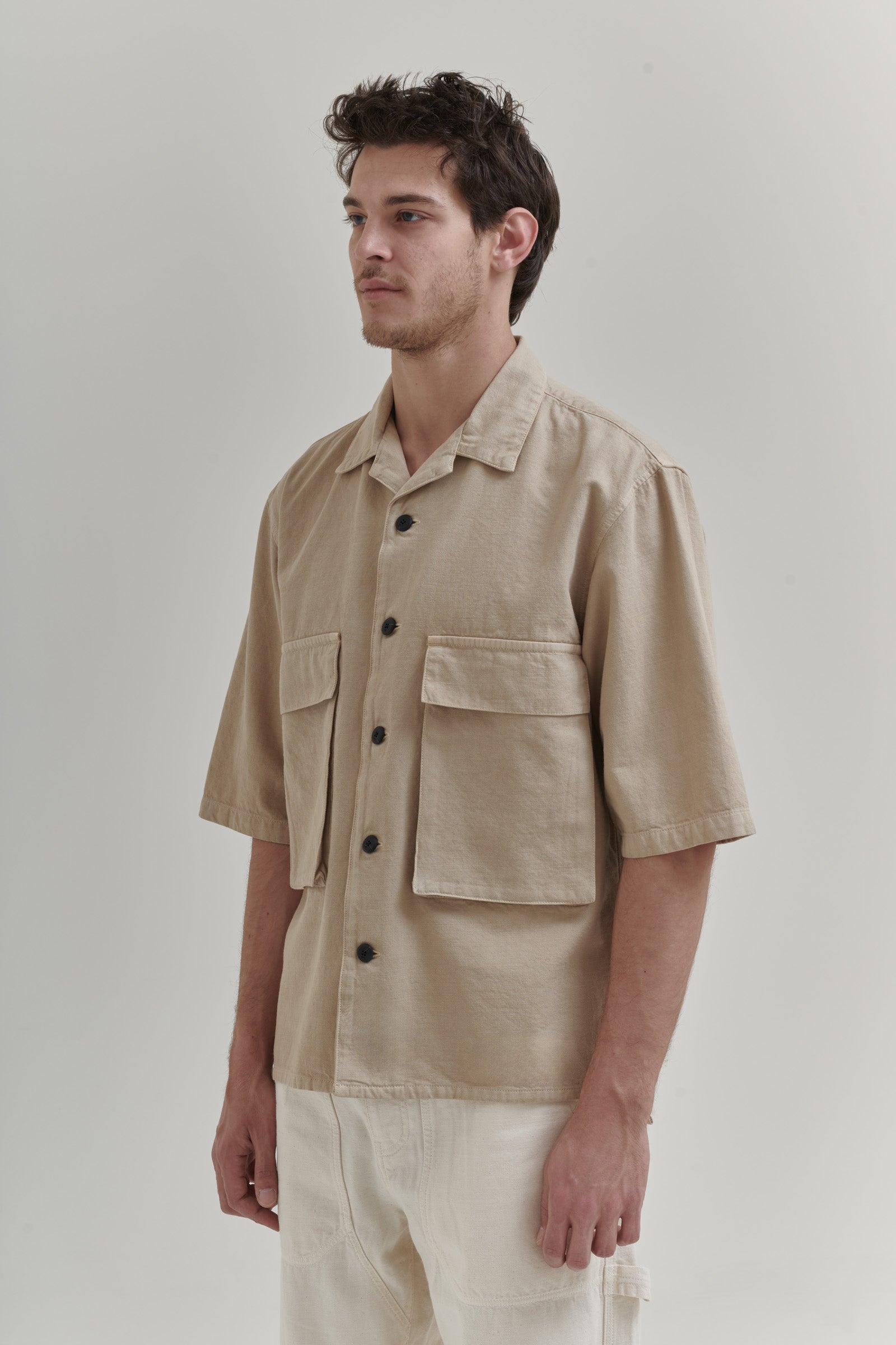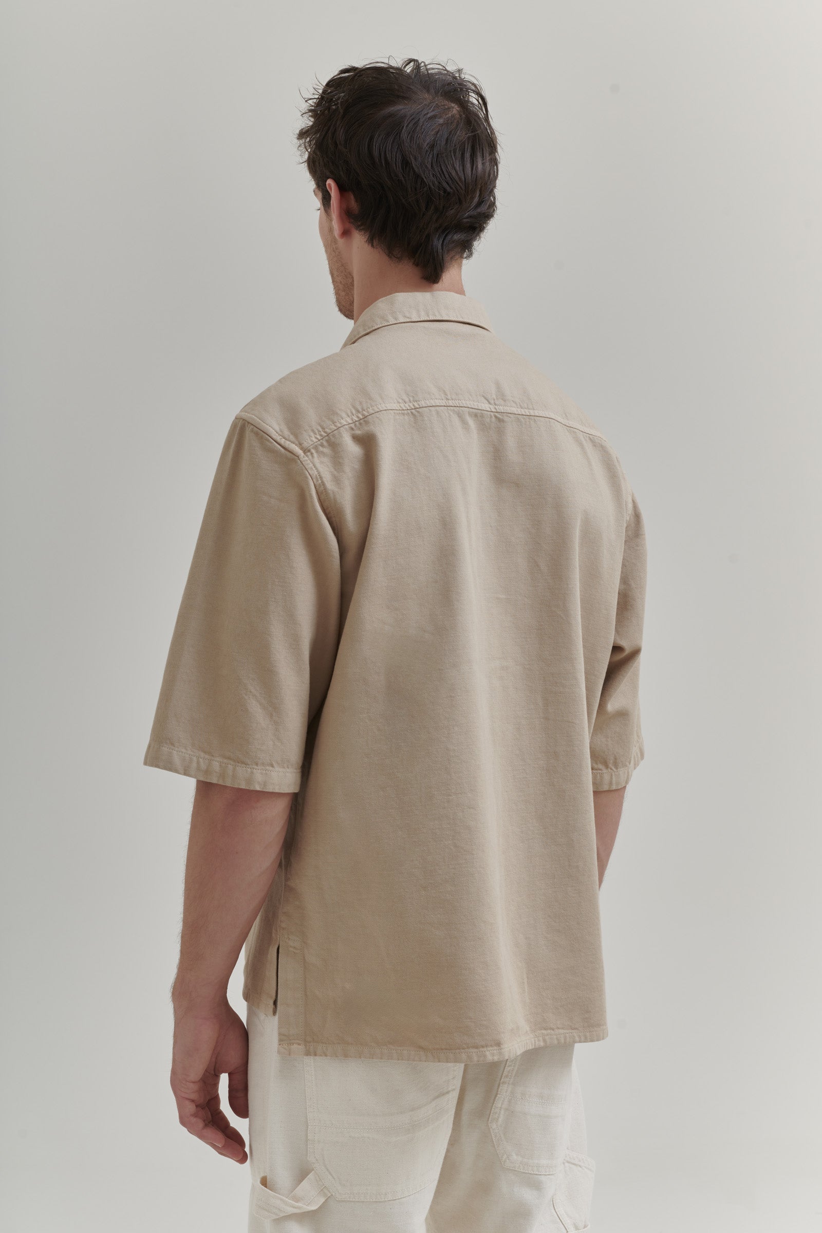 LE ORIGINI DELLA BOWLING SHIRT, CONOSCIUTA ANCHE COME CAMP COLLAR SHIRT, SONO POCO CHIARE E PROBABILMENTE RISALGONO ALLA FINE DEL 1800. QUESTO MODELLO È DIVENTATO POPOLARE GRAZIE AL GRANDE NUMERO DI LAVORATORI CUBANI EMIGRATI NEGLI STATI UNITI DOPO LA SECONDA GUERRA MONDIALE. NOI ABBIAMO INTERPRETATO LA BOWLING SHIRT SECONDO LO STILE TRC2038. LA VESTIBILITÀ È AMPIA E BOXY CON SPALLA SCESA E DUE GRANDI TASCHE FRONTALI. IL CAPO È STATO SOVRATTINTO IN KHAKI, TIPICO COLORE DELL'ABBIGLIAMENTO MILITARE.