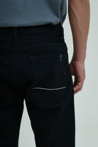 È realizzato in denim nero cimosato, uno dei colori più distintivi della collezione di tessuti Candiani. Il denim cimosato è la tipologia più autentica e si distingue per la presenza di una banda bianca o colorata, attraversata da una cucitura in contrasto.