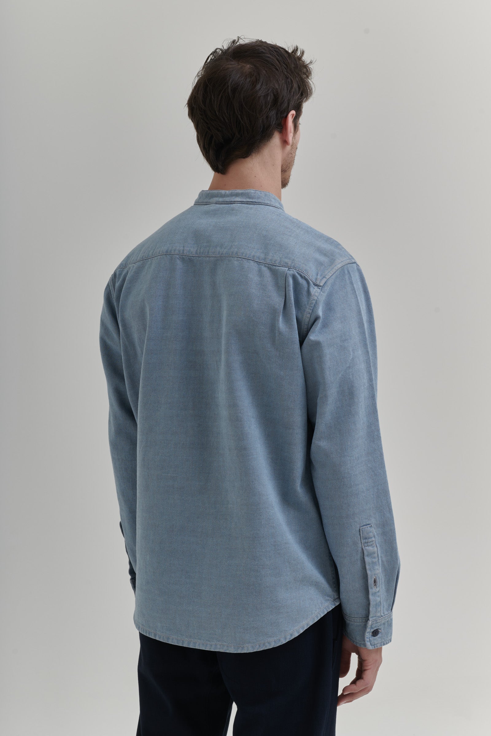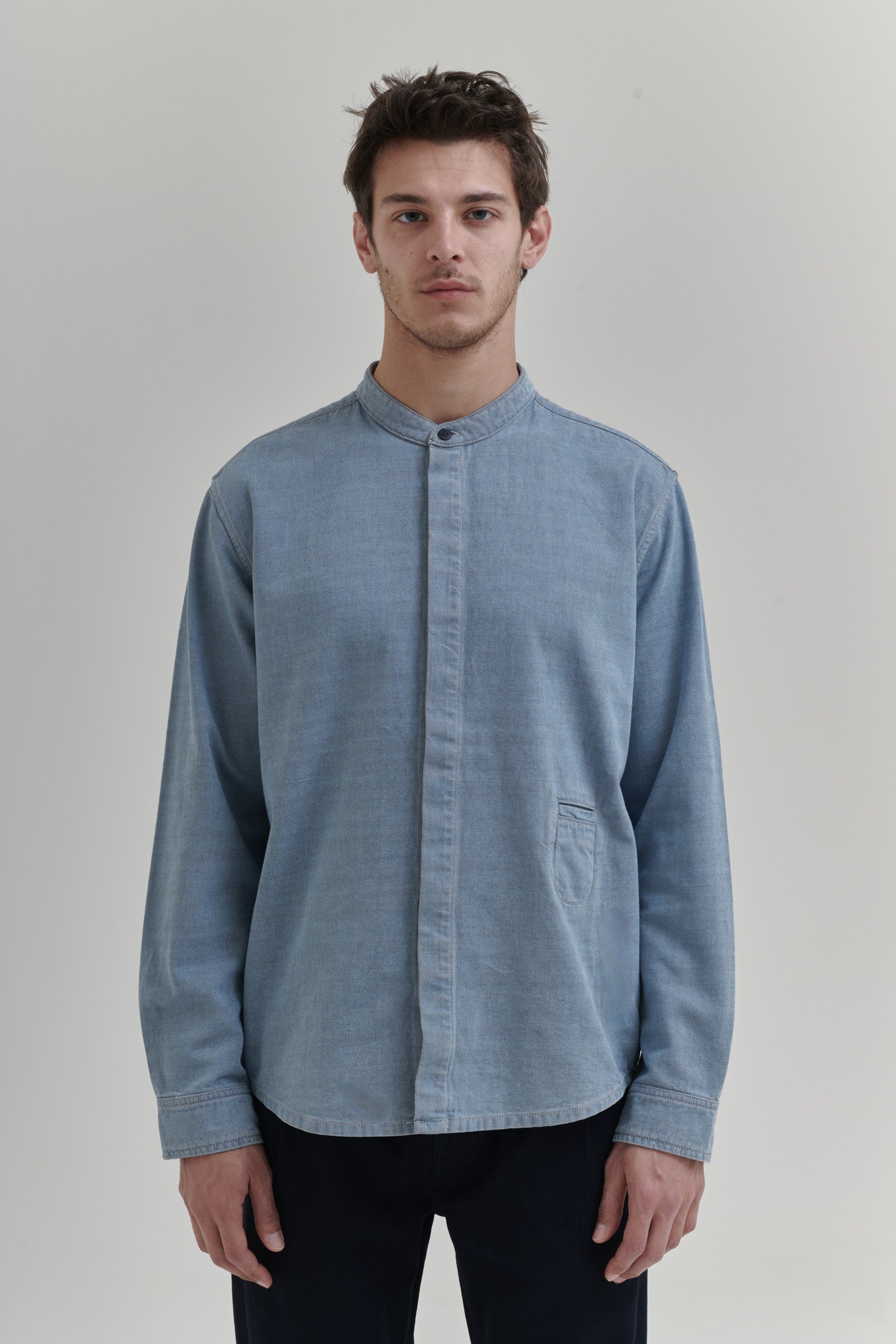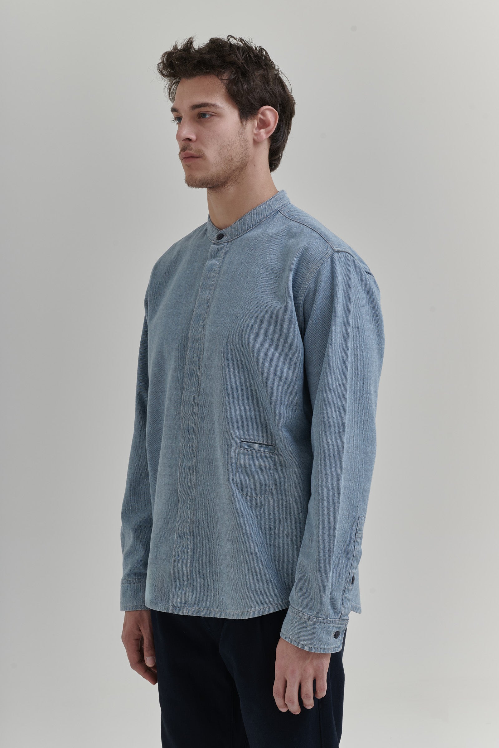 LA STAND UP COLLAR SHIRT È UNA CAMICIA DAL DESIGN MINIMALISTA, CHE SI CONTRADDISTINGUE PER LA PARTICOLARITÀ DEL COLLO, REALIZZATO SOLO DAL LISTINO E SENZA LA VELA, CIOÈ SENZA IL CLASSICO COLLETTO A PUNTA. QUESTA COSTRUZIONE ERA TIPICA DELLE GIACCHE DEGLI UFFICIALI DEGLI ESERCITI EUROPEI NEL 1800.